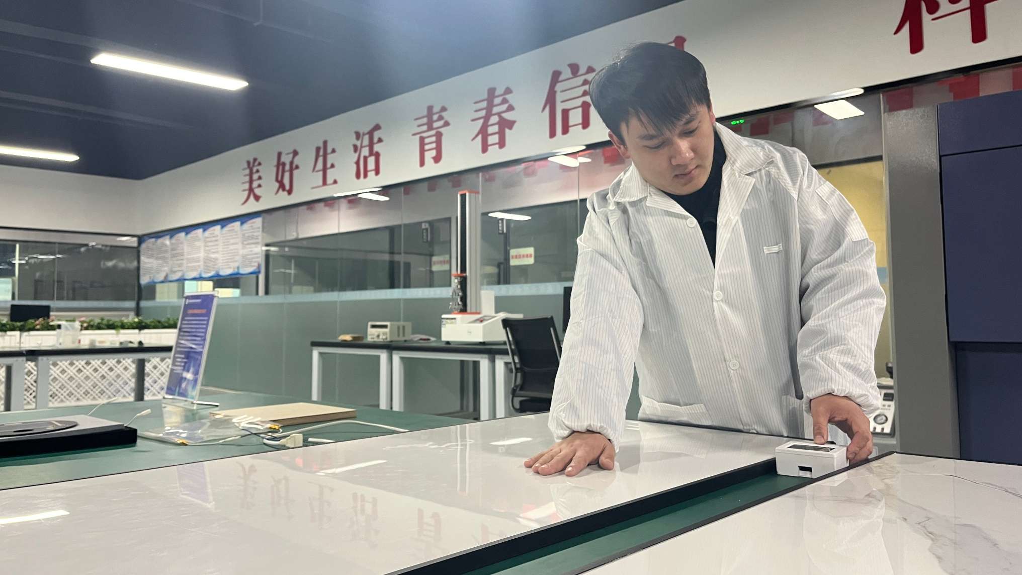 在发热展厅,公司技术部研究员郭靖正触摸一块竖立的大理石墙板向记者展示:“您摸一摸,这墙板看着是普通大理石,覆膜后就能发热,搭配红外半导体电热膜地暖,很适合家庭使用。”