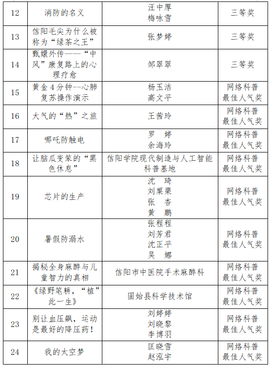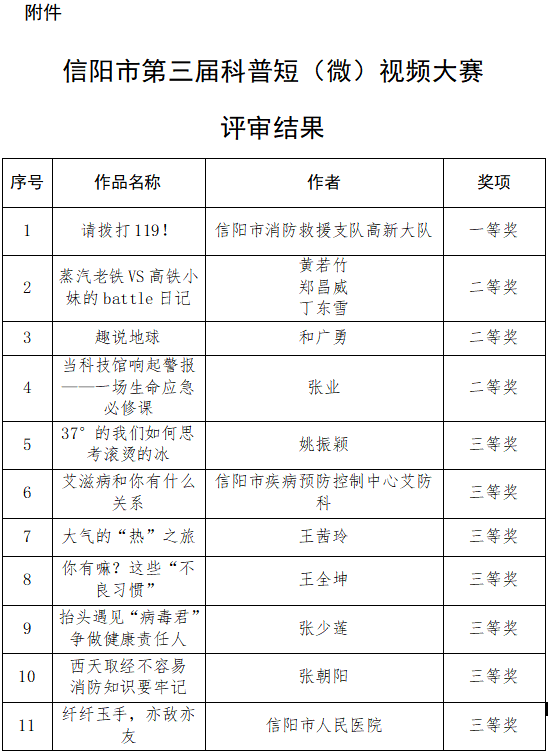 附件:信阳市第三届科普短(微)视频大赛评审结果