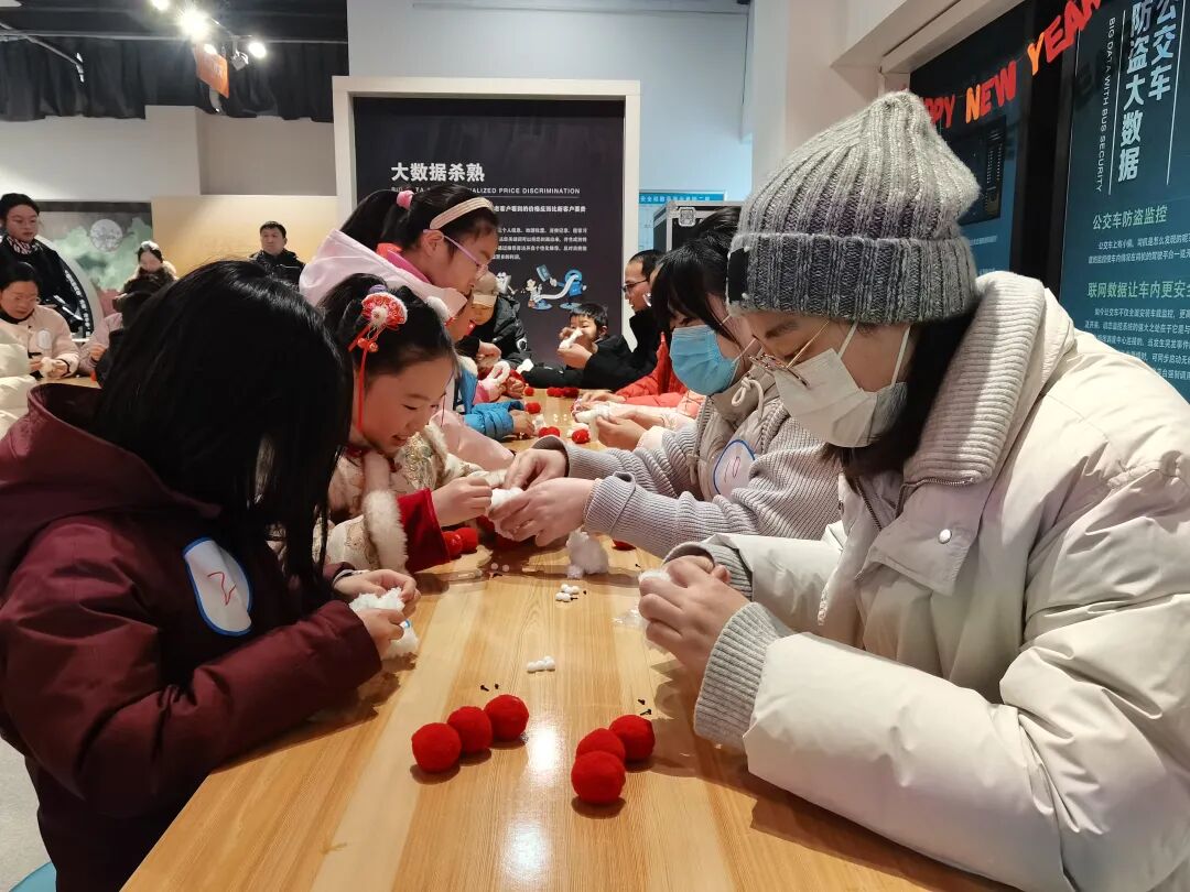 最受孩子们欢迎的,当属亲子手工DIY环节。在科技辅导员的指导下,家长与孩子携手制作小狗糖葫芦手工艺品,串红绒球、粘小狗玩偶、系祝福挂饰,一双双小手与大手默契配合,不一会儿,造型可爱的小狗糖葫芦便新鲜“出炉”。“这是我和妈妈一起做的,要把它挂在家里,迎接新年!”孩子捧着作品,脸上洋溢着笑容。