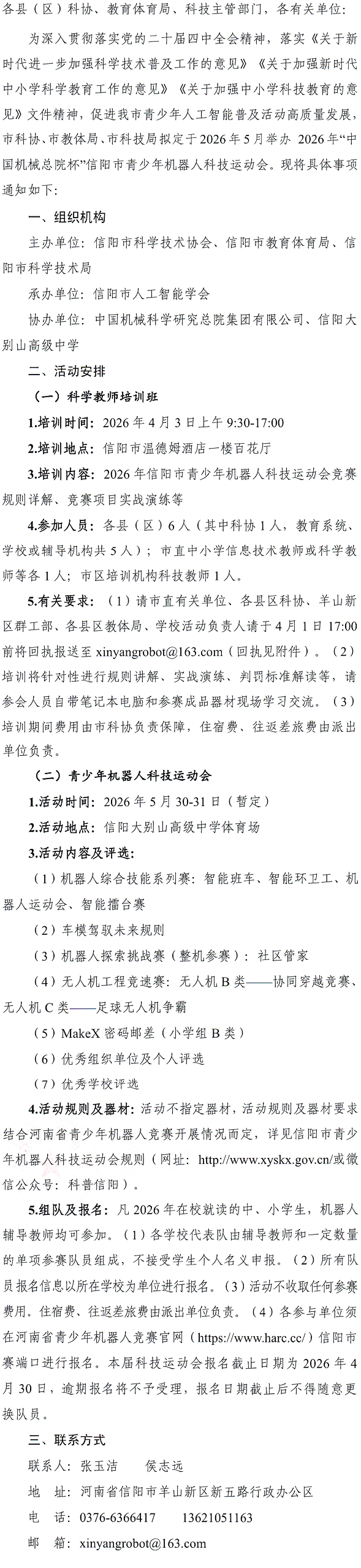 关于举办2026年“中国机械总院杯”信阳市青少年机器人科技运动会的通知