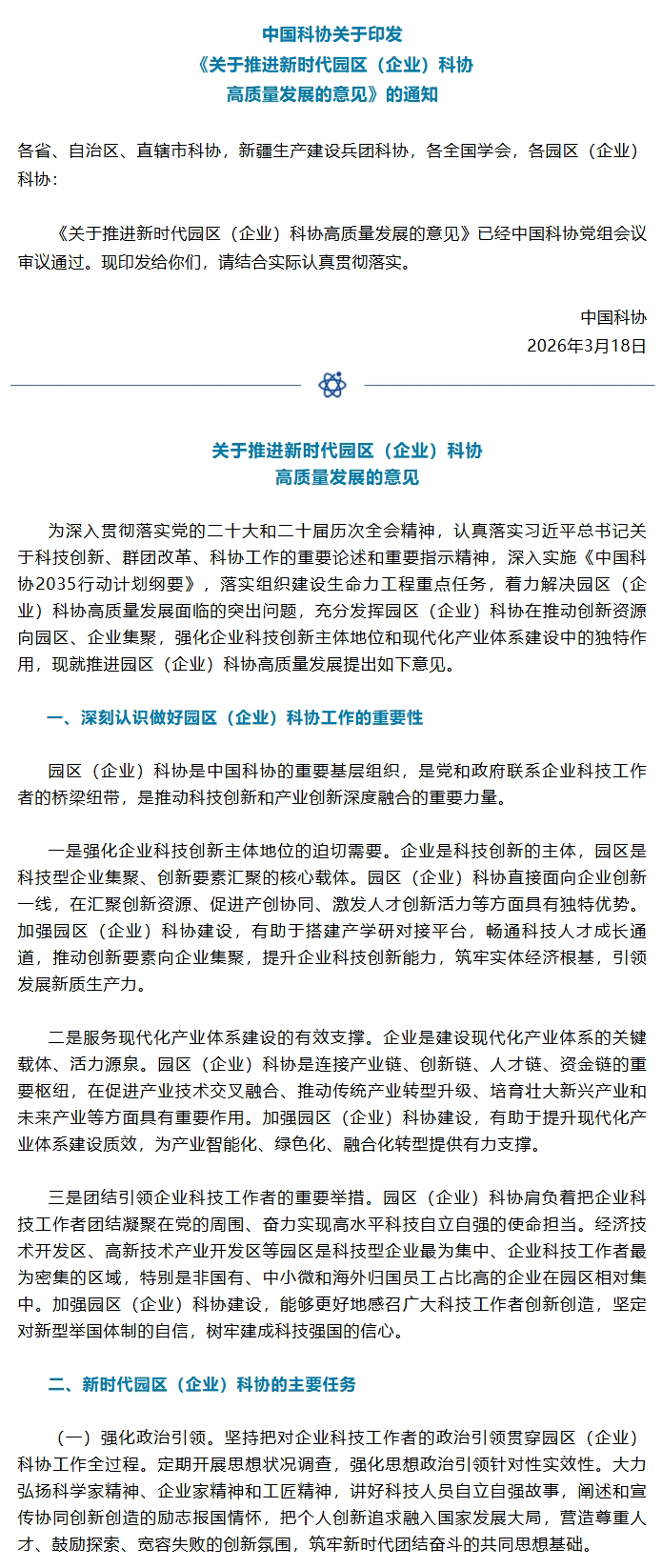 中国科协关于印发《关于推进新时代园区(企业)科协高质量发展的意见》的通知